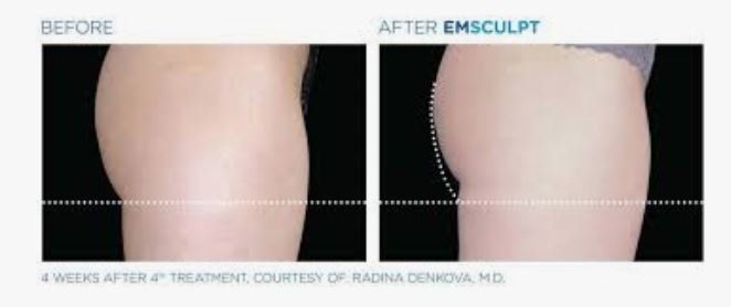 It works in two ways: you get less fat sitting above the muscle and the muscle gets bigger and stronger resulting in a more defined core. When you go through the Emsculpt treatments, the contractions are so strong that you start to notice changes in both your six pack forming and your oblique muscles coming inwards. When you look at patients who had the Emsculpt treatment, not only do they have a good six pack, the entire abdominal wall (six pack and obliques) is much tighter and they have a smaller and more defined waist. In the buttock area, we have a lot of patients who want more fullness to the buttock. It will also improve and strengthen the buttock muscle but when we do the buttock treatment, we use a different protocol since we don't want a lot of fat loss because most men and women are looking for more fullness. This is much more than what you can achieve by doing squats at the gym.